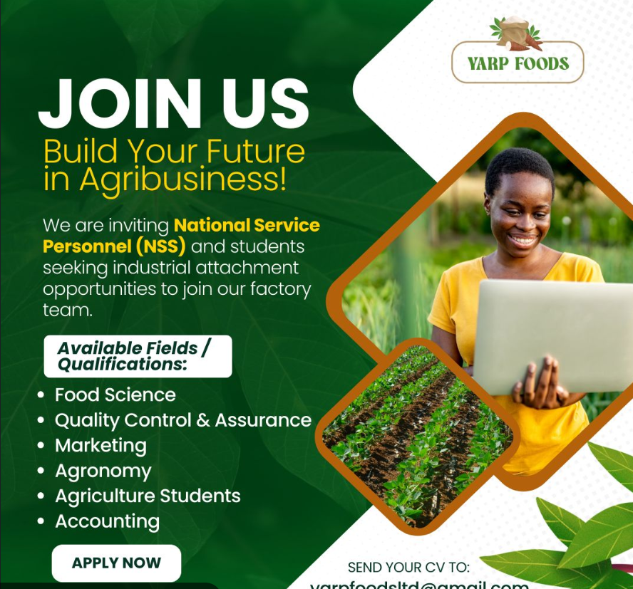 Are you a National Service Personnel (NSS) or a student looking for industrial attachment in a fast-growing agribusiness? Join YARP Foods Ltd, a climate-smart, zero-waste company transforming cassava into high-quality flour and eco-friendly products. 🌱